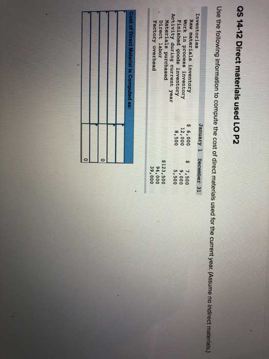 The following data from the just-completed year are taken ... from img.homeworklib.com The ending inventory for one accounting period becomes the starting point for the next period. For example, the air filters used in the ventilation system. Obtain the value of direct materials inventory at the beginning of the year. They also form a considerable and noticeable part of the finished product. The direct materials price variance and the direct materials quantity variance. With time logs and time sheets, companies just take the number of hours worked multiplied by the hourly rate. Let's use the materials budget. However, they are necessary for the production of the process.